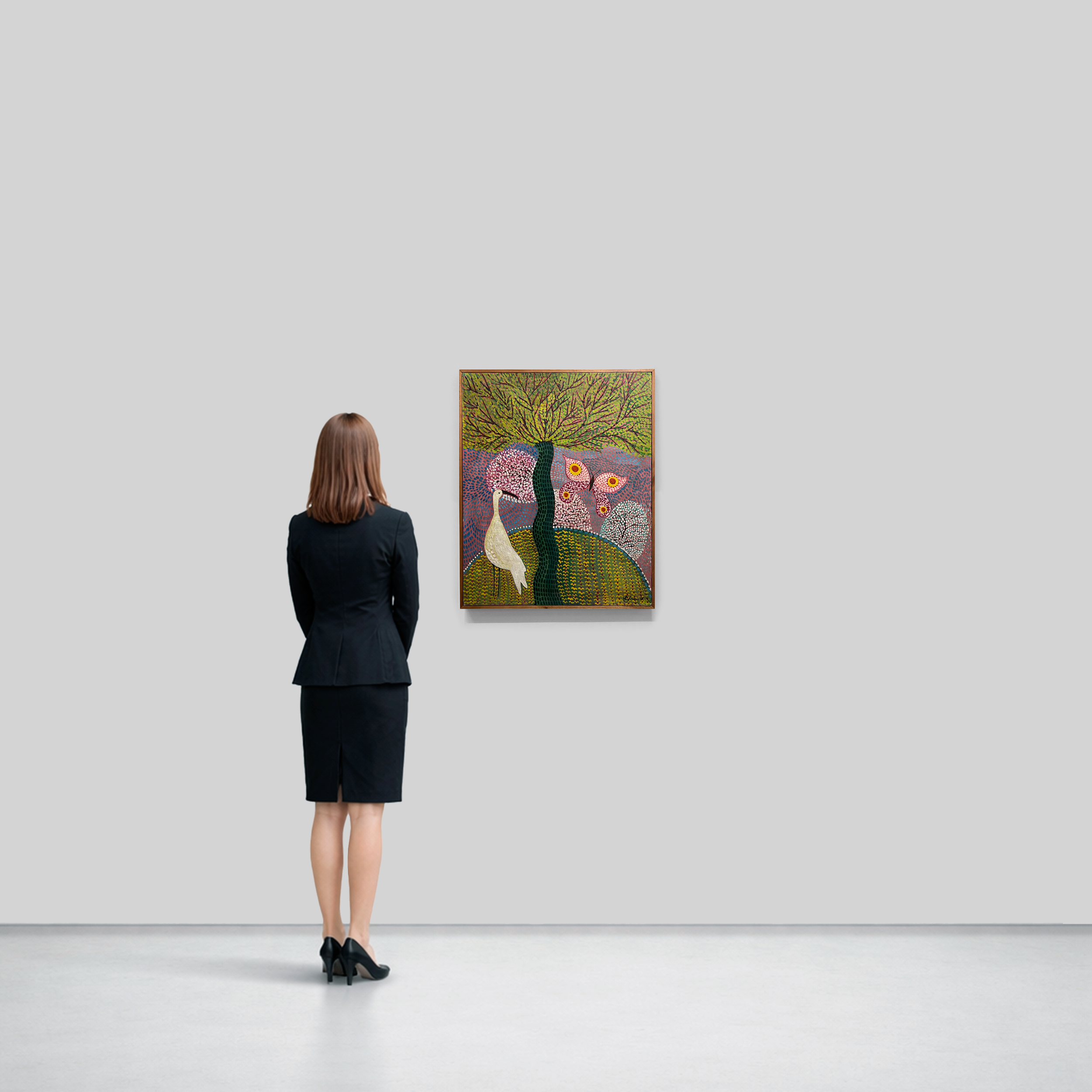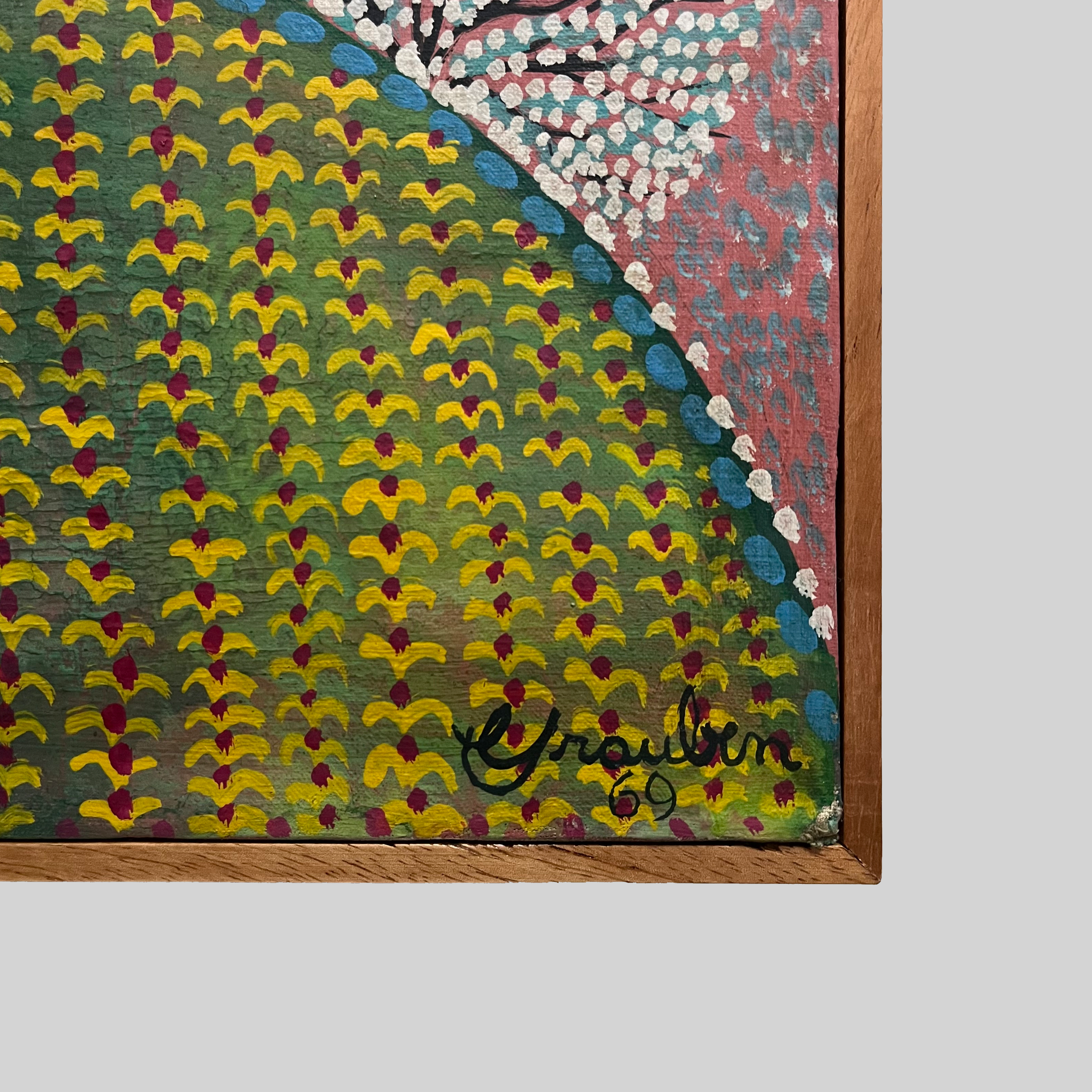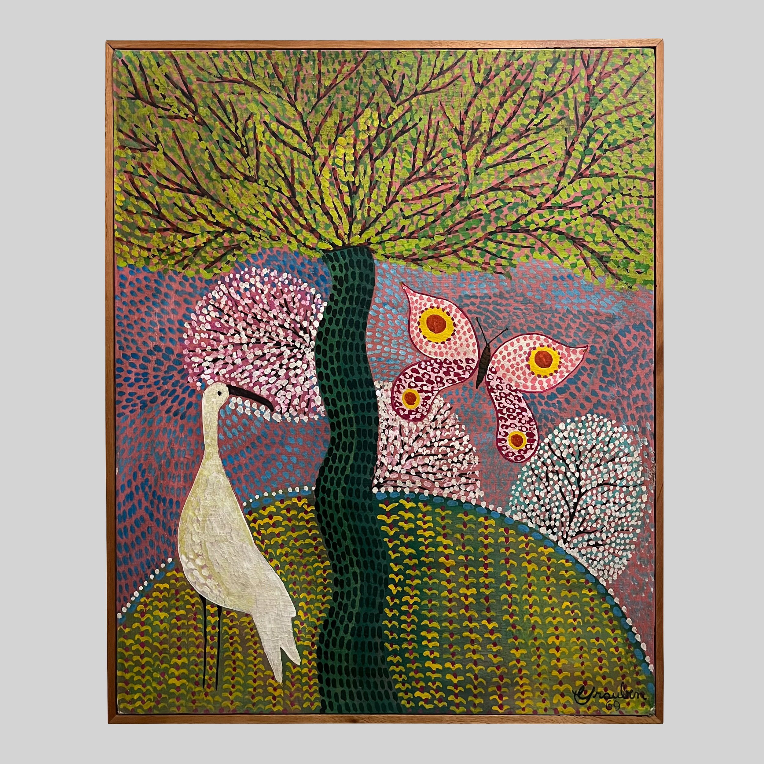 Essa obra, produzida na fase mais tardia da artista, explora as temáticas recorrentes em Grauben - os pássaros, borboletas e a natureza - mas o faz de um modo que salta aos olhos pela riqueza e equilíbrio da composição. Tanto do ponto de vista das linhas quanto da paleta dupla complementar verde-e-rosa, a cena retratada pondera forma e textura de modo a refletir abaixo o que está acima, e vice-versa. Um tronco em zigue-zague divide a tela em dois blocos, que também se que se compensam na relação entre a garça, com os pés no chão, e a borboleta, no céu.