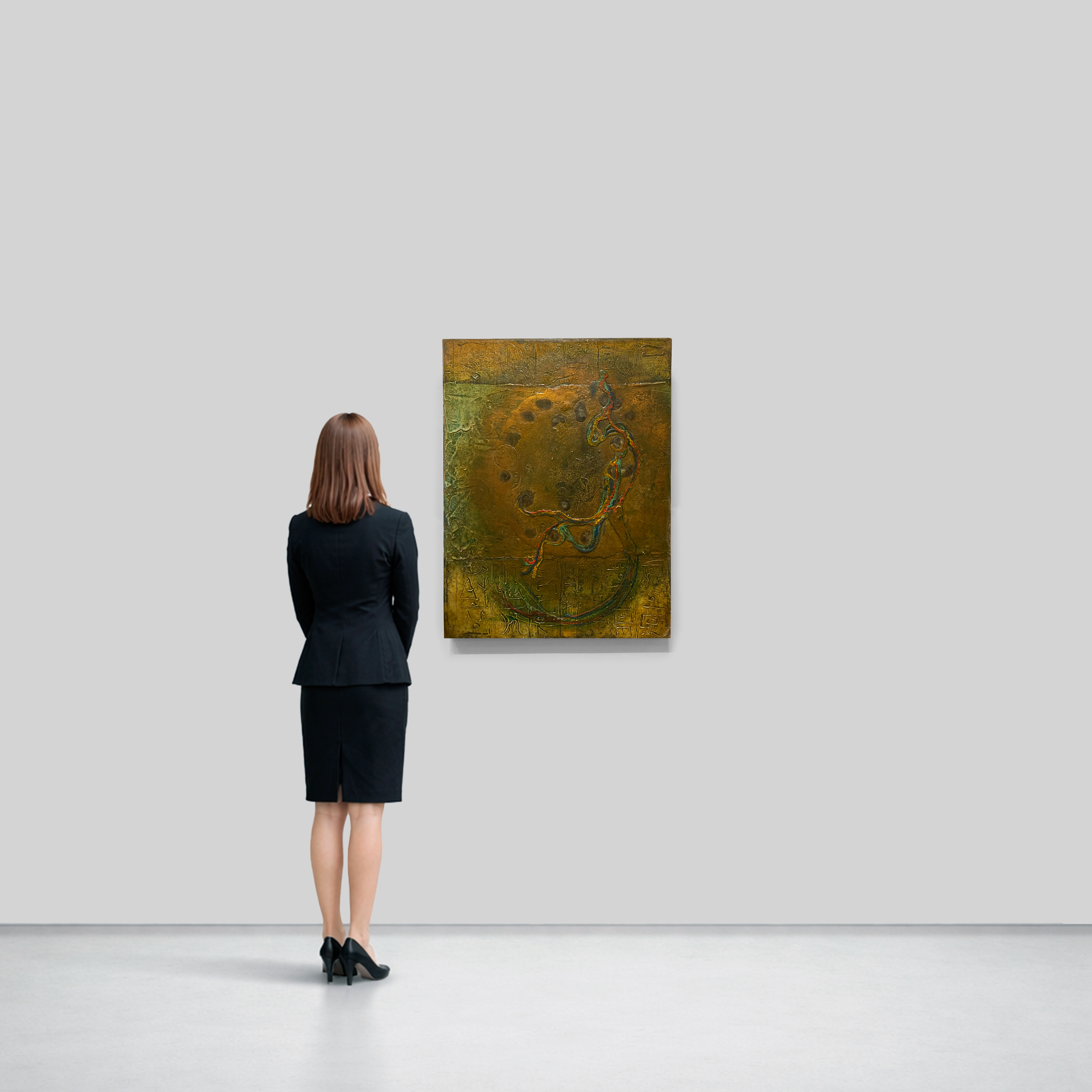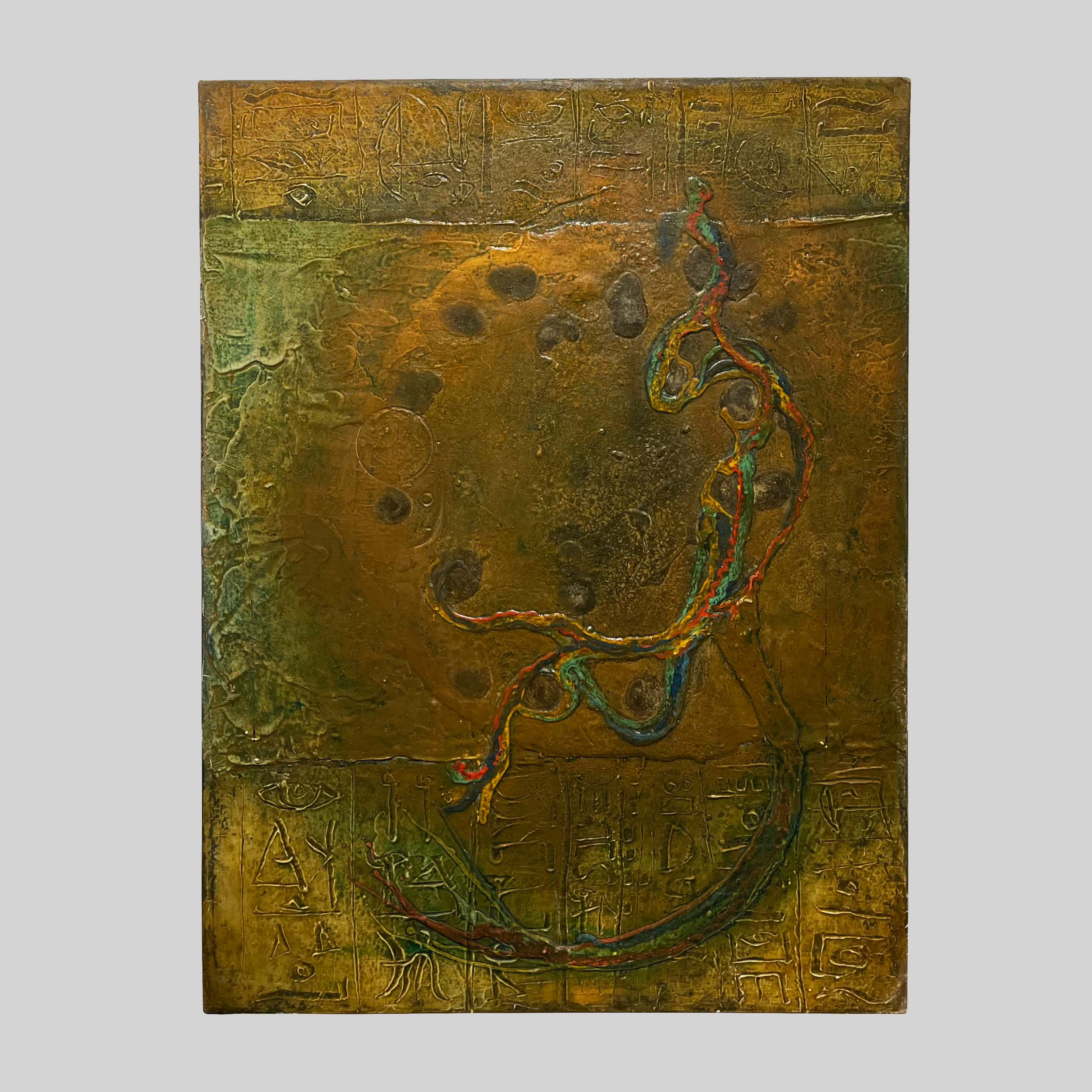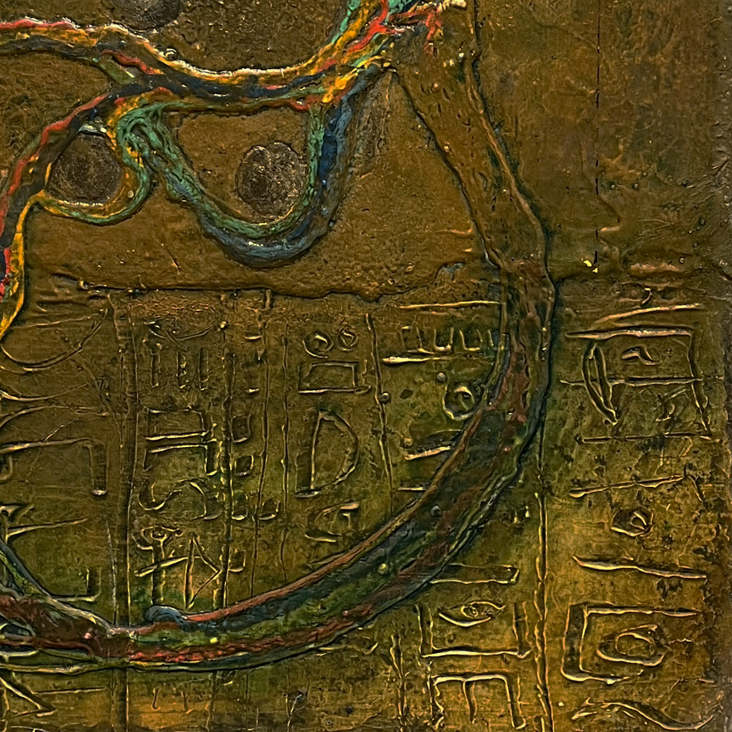 Essa obra de 1970 data do início da trajetória artística de Sachiko no Brasil, tendo sido executada 5 anos após a sua chegada. É uma pintura importante na historiografia da artista, pelo momento divisor de águas em que foi produzida - um ano antes de suas conhecidas incursões pelas culturas pré-Colombianas na América Central e do Sul em 1971. Aqui, a artista manifesta com maestria aquela que é uma de suas marcas registradas - a representação de uma linguagem ideográfica, que aparece em relevo nos blocos superior e inferior da obra, organizados em colunas tal qual hieróglifos egípcios.